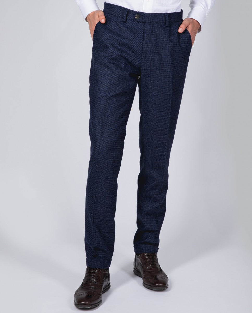 Ref. 1118003. Calças de corte clássico com bolsos laterais inclinados, um bolso traseiro e bolso para relógio. Uma peça clássica e intemporal, para quem valoriza um corte impecável.