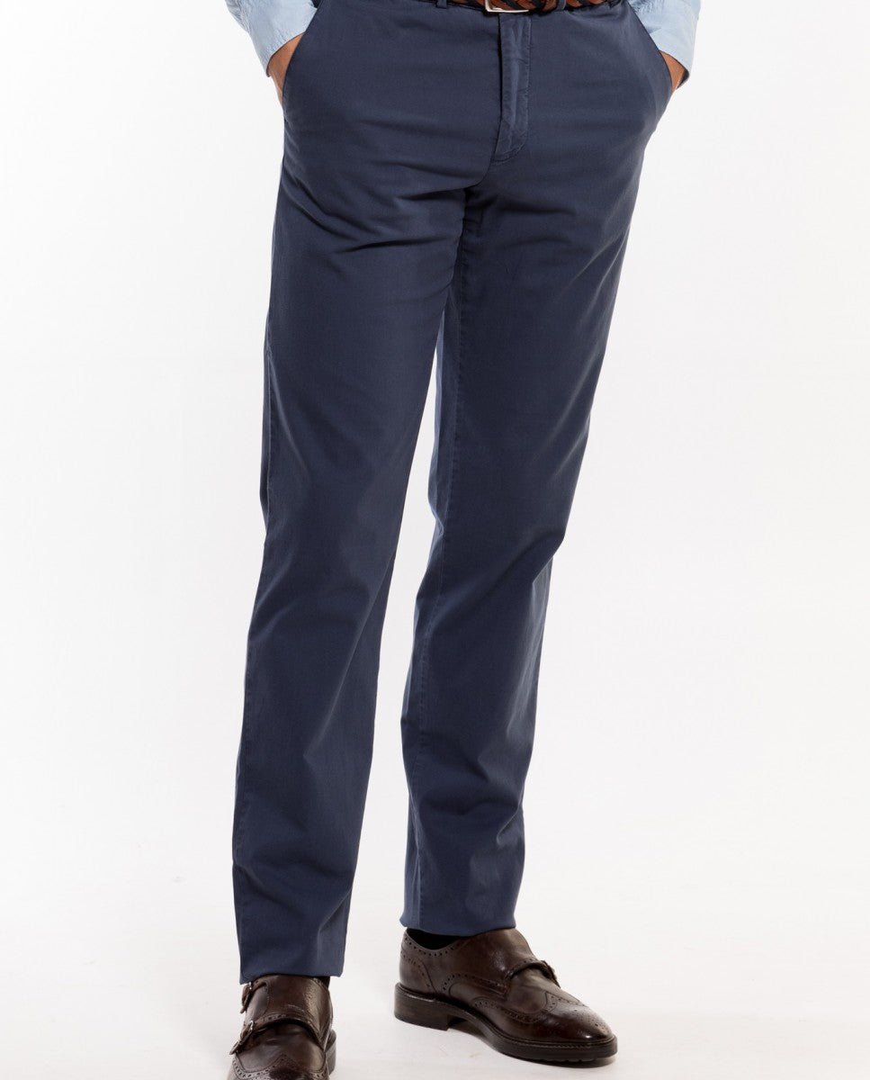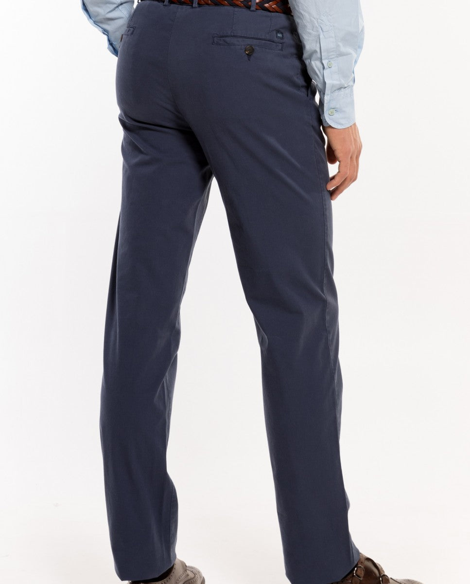 Ref. 1003068. Calças com bolsos inclinados, fecho de correr e um botão. A opção casual de um cavalheiro que valoriza estilo e conforto. Fit - Regular Composição - Algodão, Elastano Padrão - Grão Cor - Azul Escuro